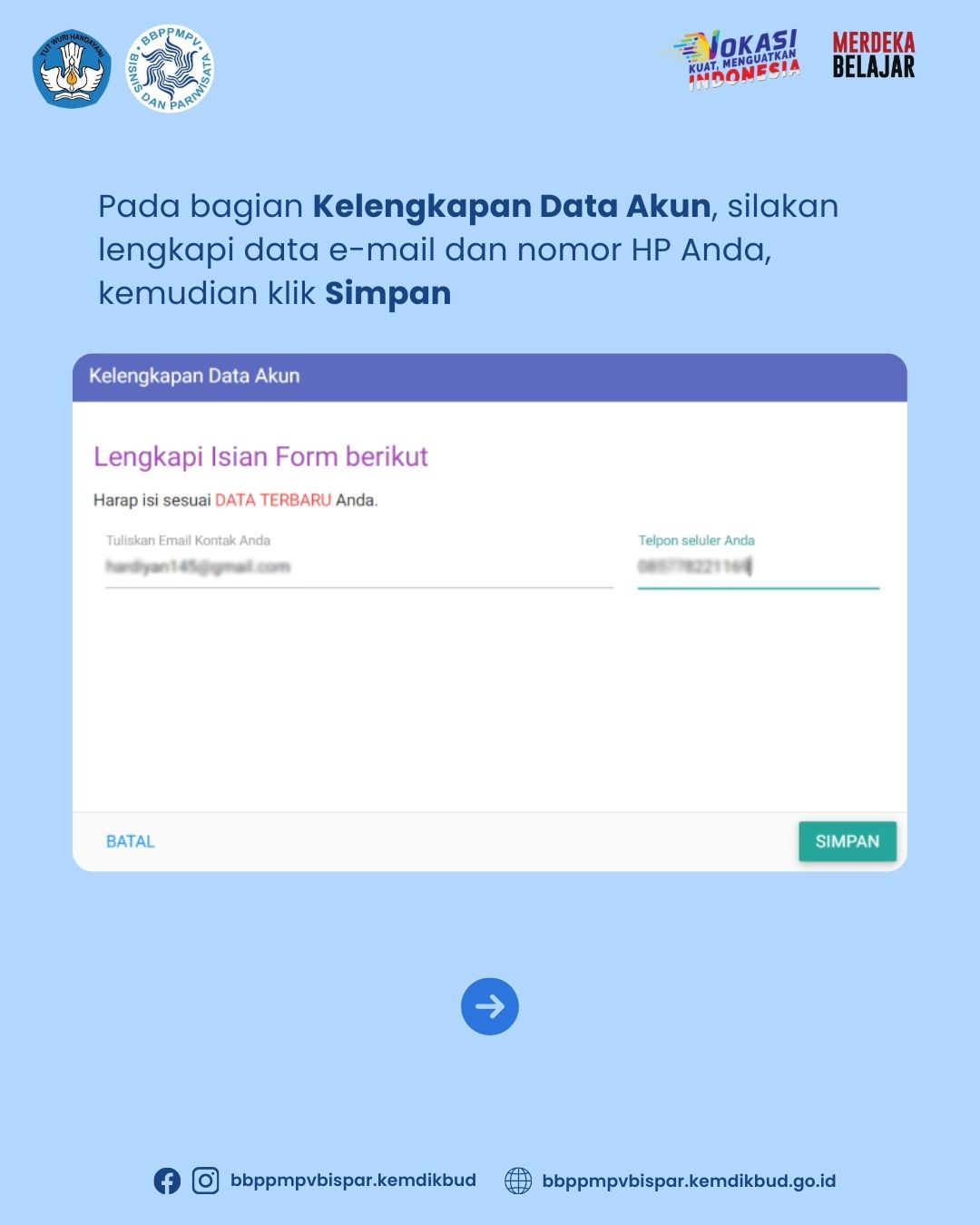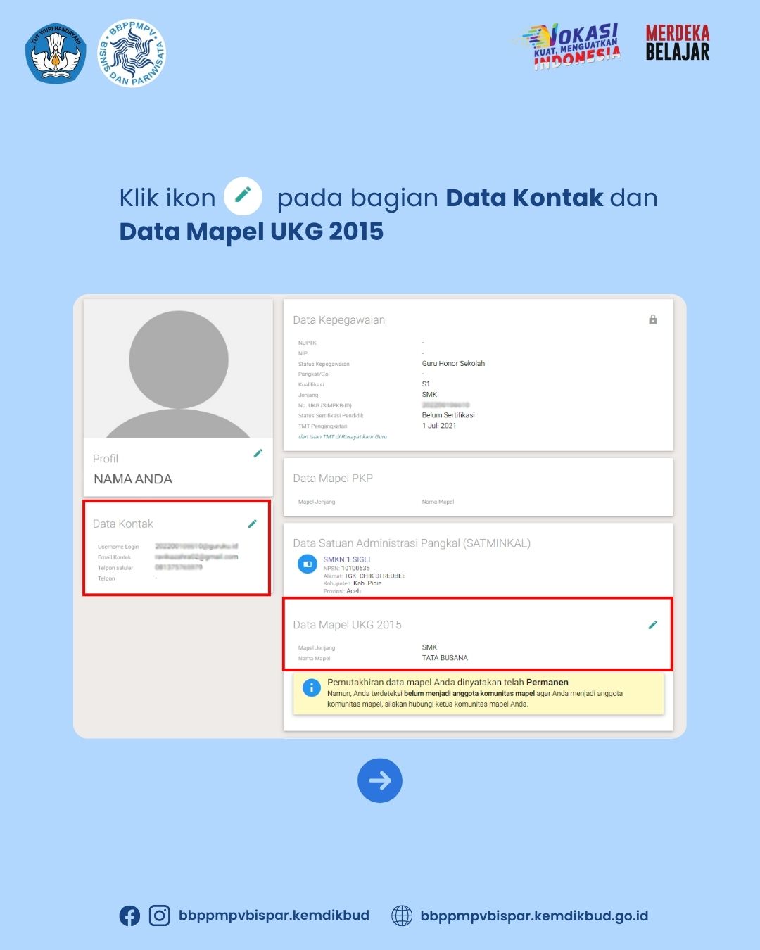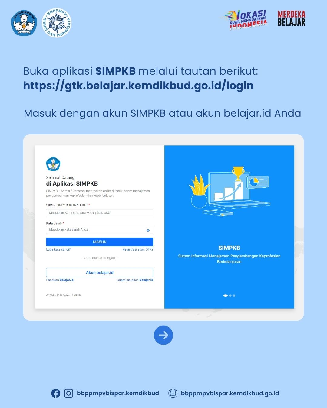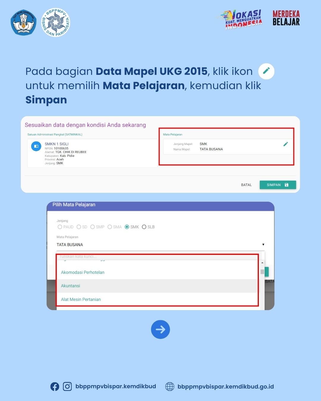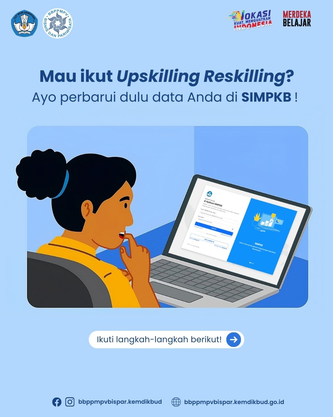 BBPPMPV Bisnis dan Pariwisata pada tahun anggaran 2024 akan menyelenggarakan kegiatan Program Upskilling dan Reskilling berstandar industri bagi guru SMK program keahlian Bisnis dan Pariwisata dengan sasaran sejumlah 3.061 peserta. Sehubungan dengan program Upskilling dan Reskilling tersebut sebagai langkah awal, kami mengimbau kepada Bapak/Ibu guru program keahlian Administrasi Profesional/OTKP, Akuntansi, Bisnis Daring dan Pemasaran, Pekerjaan Sosial, Caregiver, Kuliner, Perhotelan, Tata Busana, Tata Kecantikan, dan Usaha Perjalanan Wisata, untuk memperbarui data profil (data pribadi dan data mata pelajaran UKG) pada aplikasi SIMPKB.