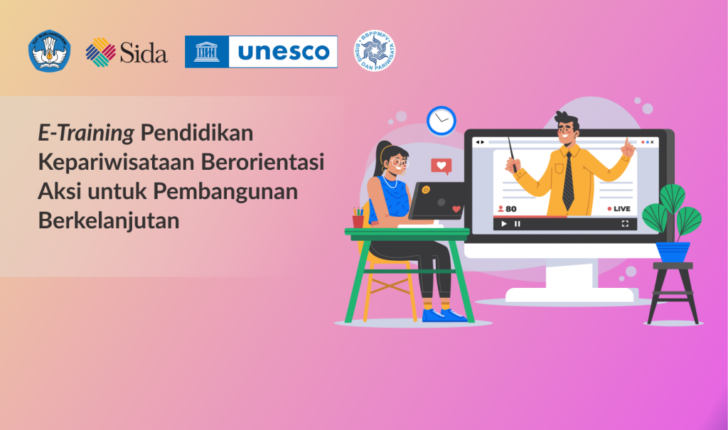 Dalam rangka sosialisasi pengembangan pendidikan berkelanjutan bagi Sekolah Menengah Kejuruan bidang Pariwisata, UNESCO Jakarta bekerjasama dengan Balai Besar Pengembangan Penjaminan Mutu Pendidikan Vokasi (BBPPMPV) Bisnis dan Pariwisata, Direktorat Jenderal Pendidikan Vokasi Kemendikbudristek akan menyelenggarakan E• Training Pendidikan Kepariwisataan Berorientasi Aksi untuk Pembangunan Berkelanjutan. E-Training diperuntukan bagi Wakil Kepala Sekolah bidang Kurikulum, dan Guru Produktif Tata Boga, Tata Kecantikan, Akomodasi Perhotelan, & Usaha Perjalanan Wisata periode 27 September s.d 6 Oktober 2021.