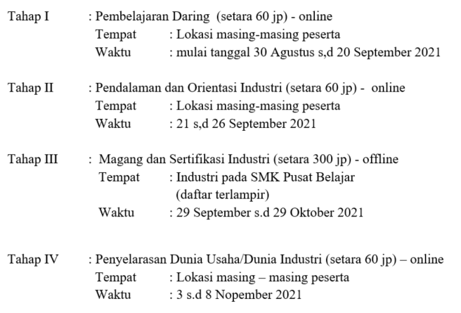 Bagi Guru Kejuruan Bidang Bisnis dan Pariwisata Sekolah Menengah Kejuruan (SMK) Pusat Keunggulan setara 480 (empat ratus delapan puluh) jam pelajaran, mulai tanggal 30 Agustus s.d 8 Nopember 2021.