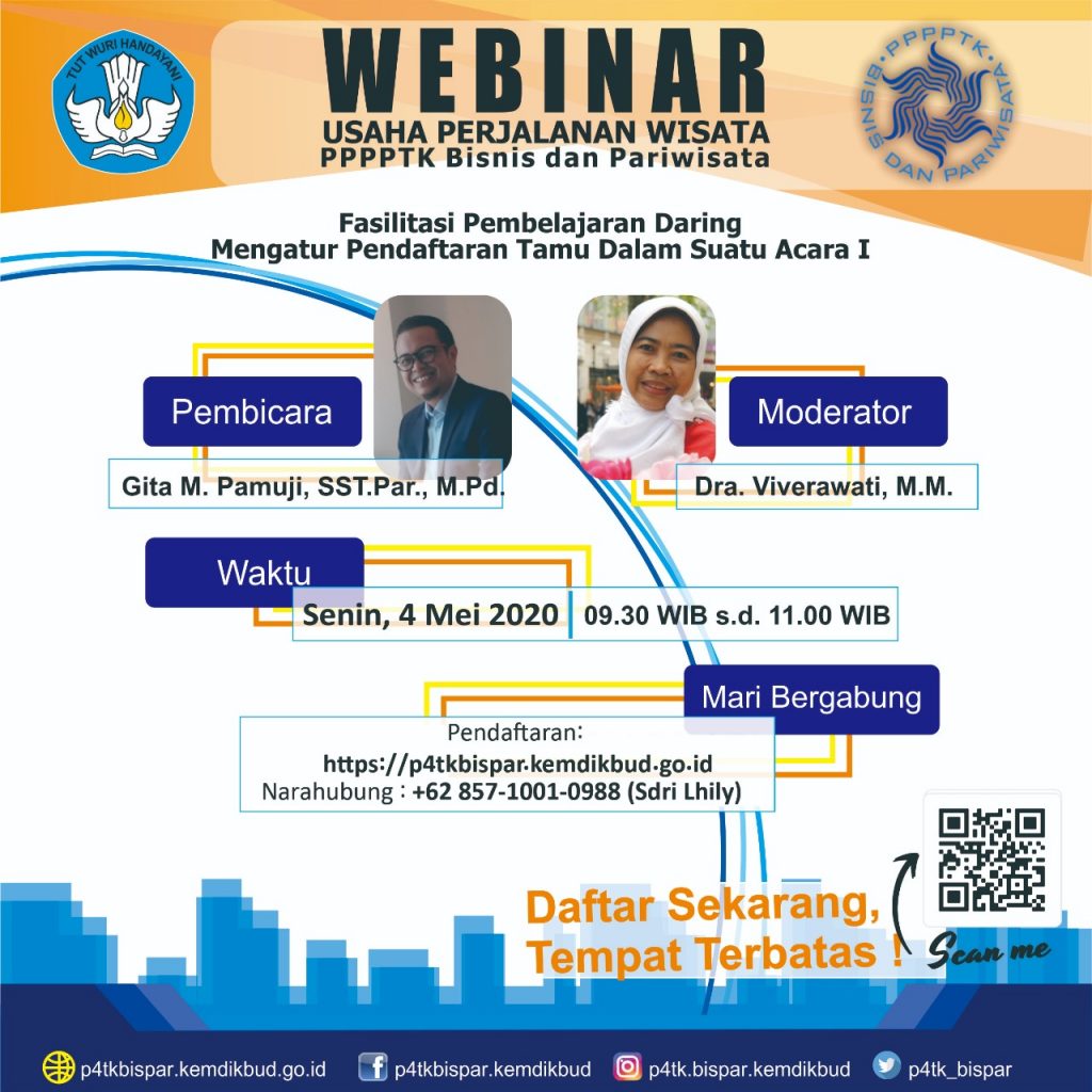 PPPPTK Bisnis dan Pariwisata membuka pendaftaran webinar jurusan Usaha Perjalanan Wisata (UPW). Kegiatan ini akan dilaksanakan pada: