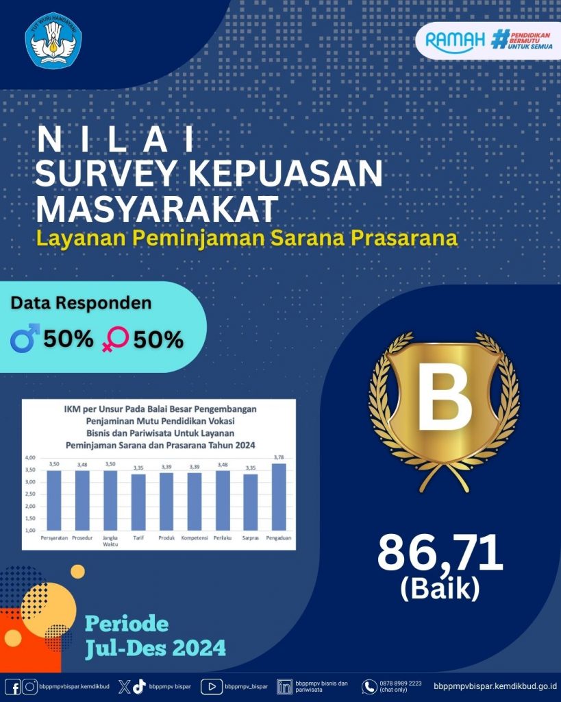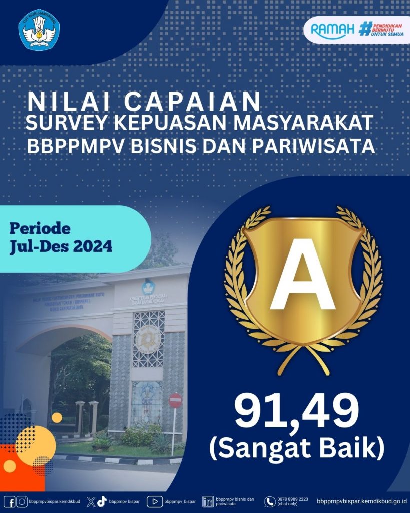 Berdasarkan Permenpan No. 14 Tahun 2017, Survei Kepuasan Masyarakat adalah pengukuran secara komprehensif kegiatan tentang tingkat kepuasan masyarakat yang diperoleh dari hasil pengukuran atas pendapat masyarakat. Melalui survei ini diharapkan mendorong partisipasi masyarakat sebagai pengguna layanan dalam menilai kinerja penyelenggara pelayanan serta mendorong penyelenggara pelayanan publik untuk meningkatkan kualitas pelayanan dan melakukan pengembangan melalui inovasi-inovasi pelayanan publik. Berikut adalah hasil survei kepuasan masyarakat yang berhasil di kumpulkan oleh BBPPMPV Bisnis dan Pariwisata.