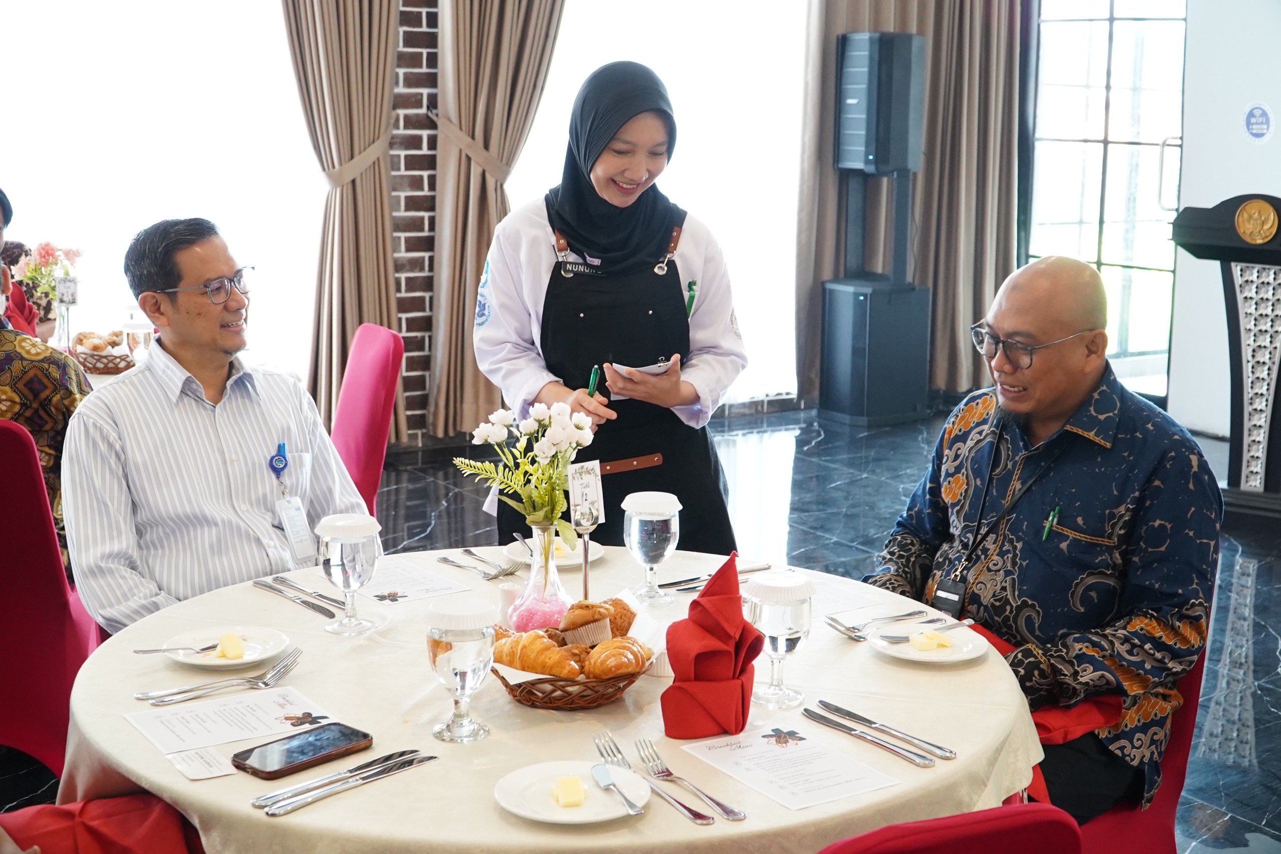 “Selamat pagi, senang sekali saya diundang di BBPPMPV Bispar untuk melihat proses pelatihan guru-guru yang belajar pastry dan cookery. Dan pagi ini kami juga diundang untuk menikmati sarapan hasil karya dari pelatihan. Makanannya luar biasa, enak-enak sekali, dan rasanya otentik,” ujar Suharti.