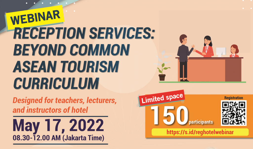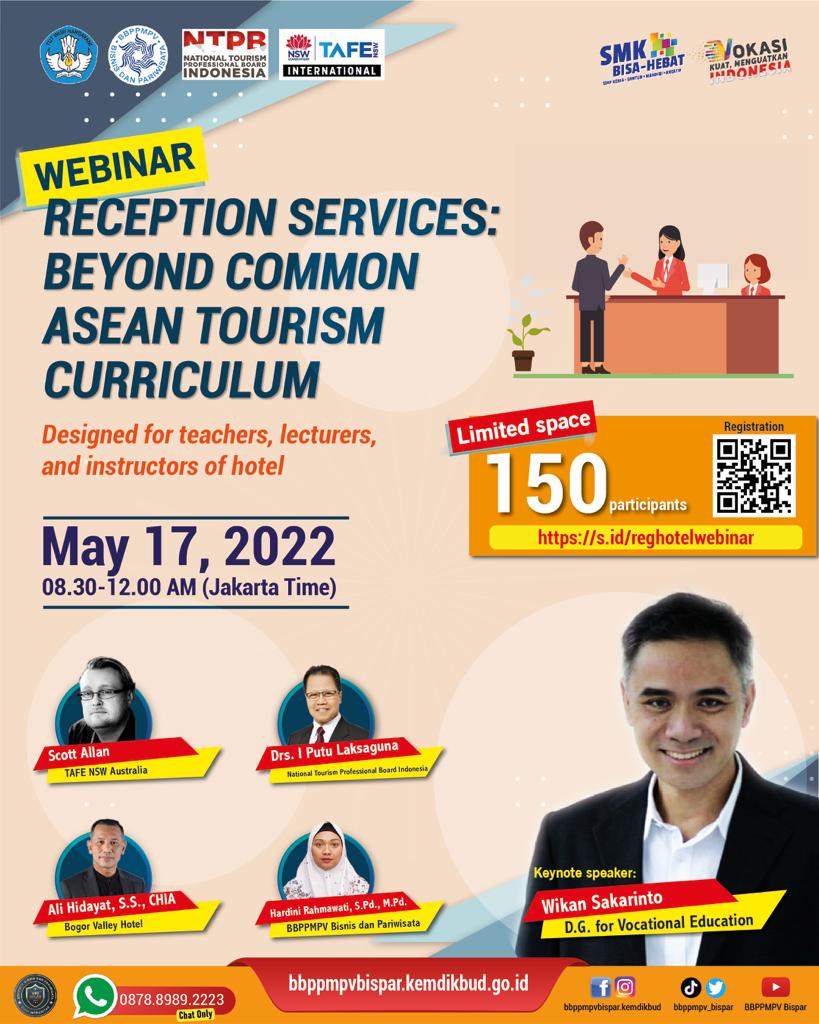 BBPPMPV Bisnis dan Pariwisata, bekerjasama dengan NTPB dan TAFE NSW Sidney, akan menyelenggarakan Webinar: Reception Services – Beyond Common ASEAN Tourism Curriculum, pada Selasa 17 Mei 2022.